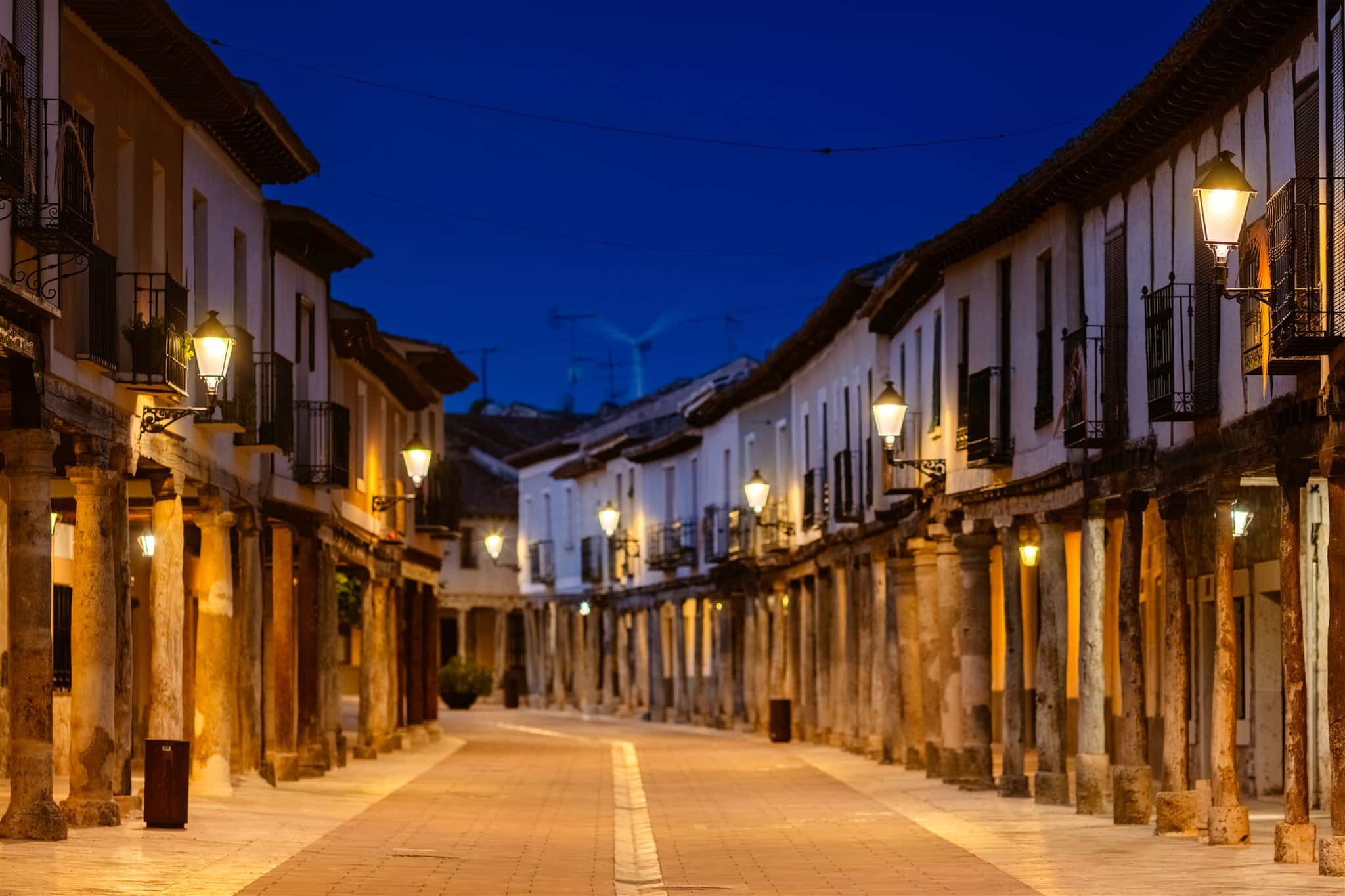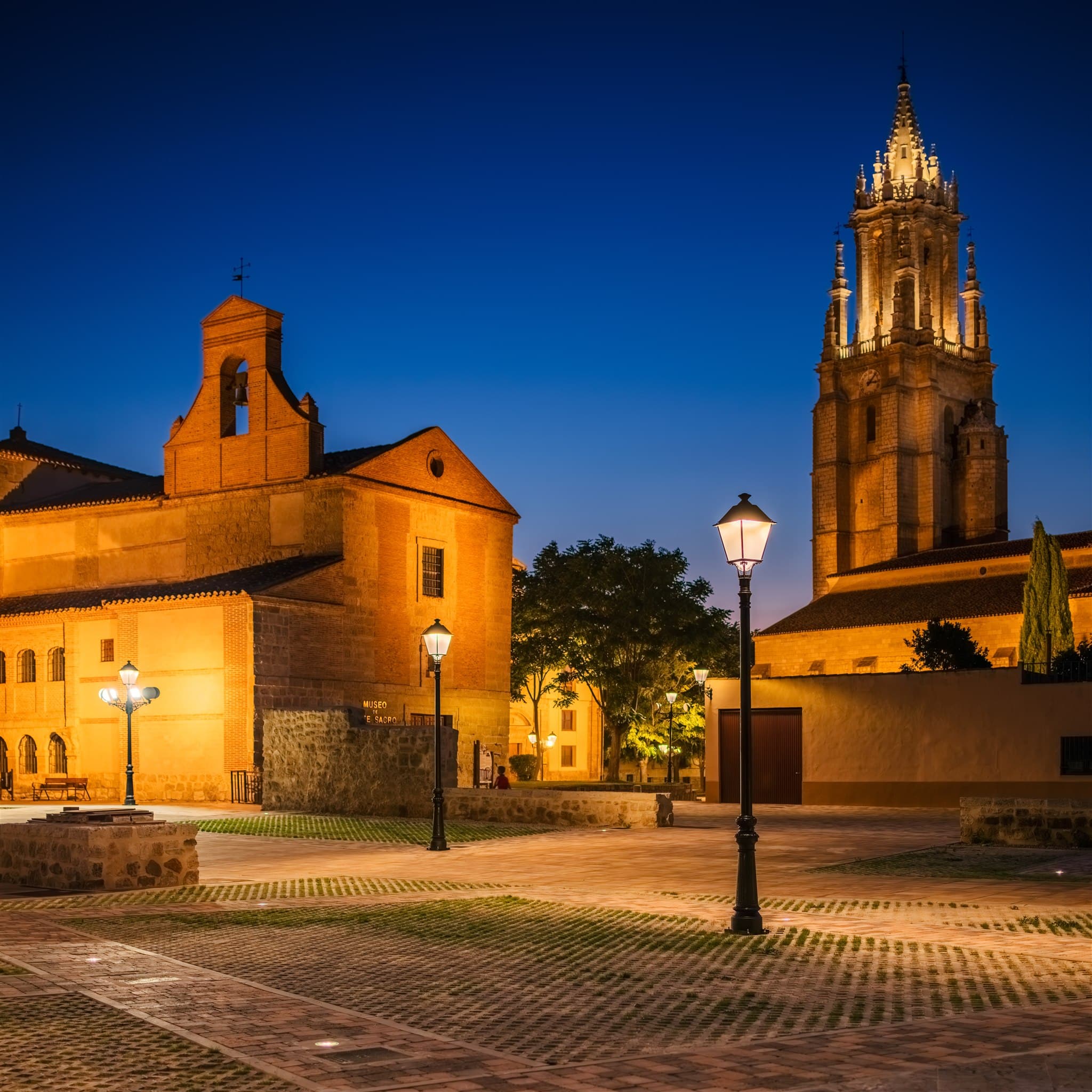 Las zonas de mayor relevancia cultural reciben un tratamiento lumínico específico. La Colegiata de San Miguel, uno de los grandes referentes del gótico-renacentista castellano, se ilumina con proyectores Aire® Serie 5 y Aire® Serie 3 en 2200 K, una temperatura de color aún más cálida que resalta volúmenes y texturas sin generar deslumbramientos ni dominantes inadecuadas en la piedra.