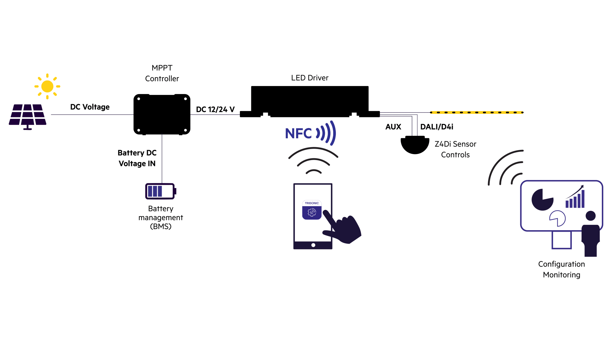 Las luminarias alimentadas por energía solar hacen que la iluminación exterior sea más flexible y sostenible. La solución ILIORA de Tridonic anuncia una nueva era en la iluminación exterior. En el corazón de la tecnología se encuentra un nuevo Driver LED CC/CC certificado D4i que permite integrar fácilmente diferentes sensores y sistemas de gestión de luz. Esto significa que para cada aplicación puede encontrarse la solución perfecta. La iluminación solar se convierte así en una solución fiable y escalable para entornos urbanos modernos. Un controlador MPPT gestiona el flujo de energía y garantiza que la energía almacenada se transfiera de forma eficaz a las luminarias LED. Los sensores integrados y los controles de última generación complementan la solución, tanto para un grupo de luminarias como para una aplicación de ciudad inteligente.