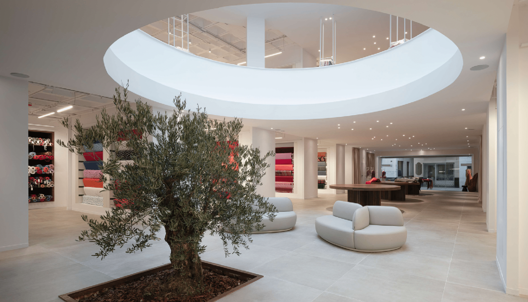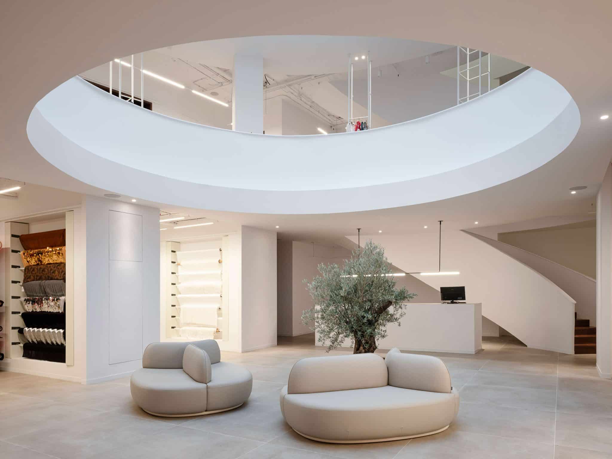 El sistema de iluminación de Simon aporta versatilidad, discreción y vanguardia técnica. El modelo Slim System, con CRI90, ofrece una luz fiel al color y natural, garantizando una excelente reproducción cromática en los tejidos. Su presencia sutil y enrasada se integra en el espacio sin alterar su pureza formal. La instalación se completa con los sistemas Hole 25 y Hole 50, soluciones empotradas que permiten un control preciso de la luz, así como una serie de proyectores diseñados para generar el efecto distintivo de la cúpula encendida durante la noche, transformando la percepción del espacio y su ambiente nocturno.