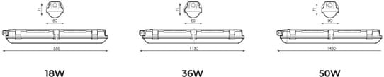 La gama está disponible en potencias de 18W, 36W y 50W, con dimensiones compactas que favorecen el montaje en superficie. Además, bajo pedido se pueden incorporar configuraciones y accesorios adicionales como:
