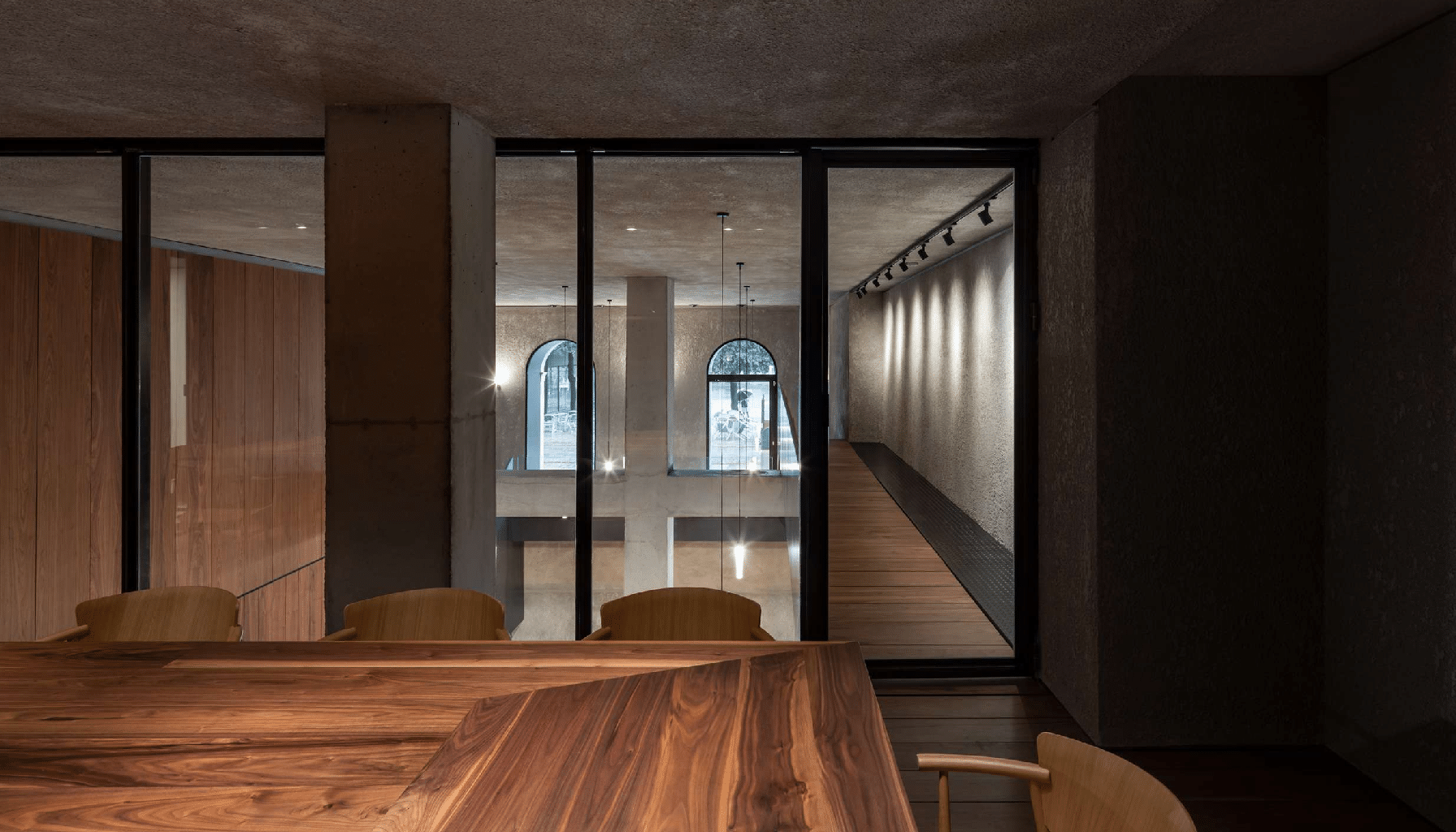 Con una superficie construida de aproximadamente 1.500 m², el restaurante ocupa un local semienterrado en una de las antiguas plazas de mercado de la ciudad. El antiguo espacio se encontraba compartimentado y con escasos huecos de fachada, por lo que el proyecto se concibió como un vaciado estructural, abriendo la edificación a la luz natural. Esta estrategia revela la anatomía oculta del edificio y genera una secuencia de espacios asimétricos en cascada que descienden desde la fachada principal hasta el fondo del restaurante, creando una atmósfera de escala cambiante y luz controlada.
