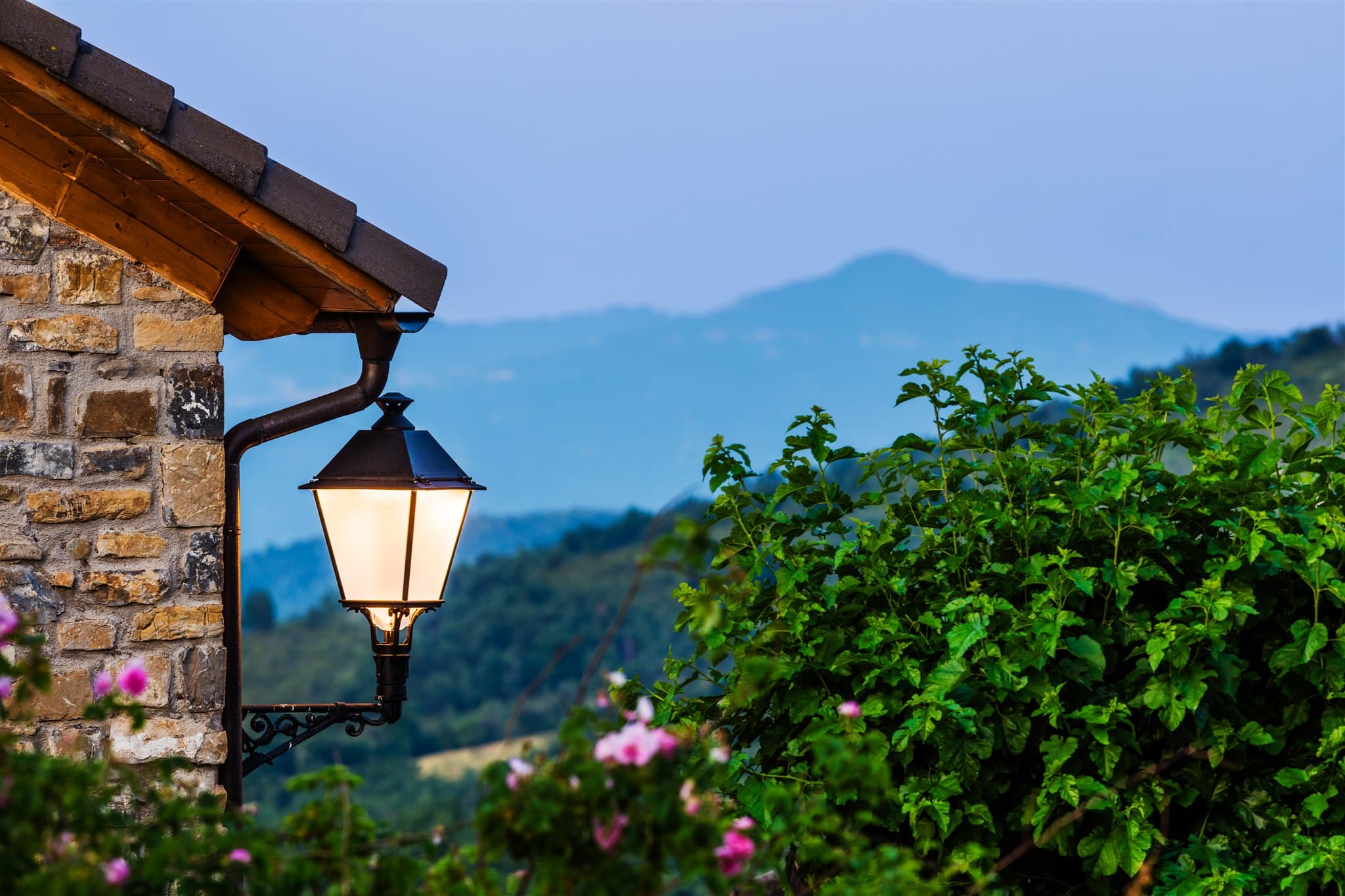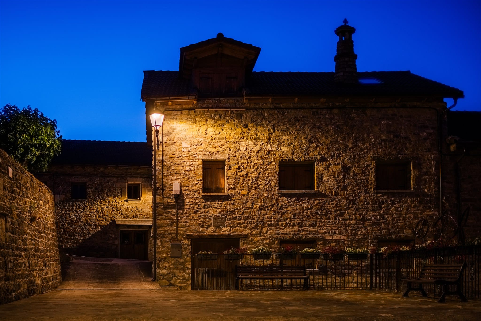 Transición del día a la noche en Sinués, con luminarias clásicas Villa XLA integradas en la arquitectura tradicional del valle de Aísa.