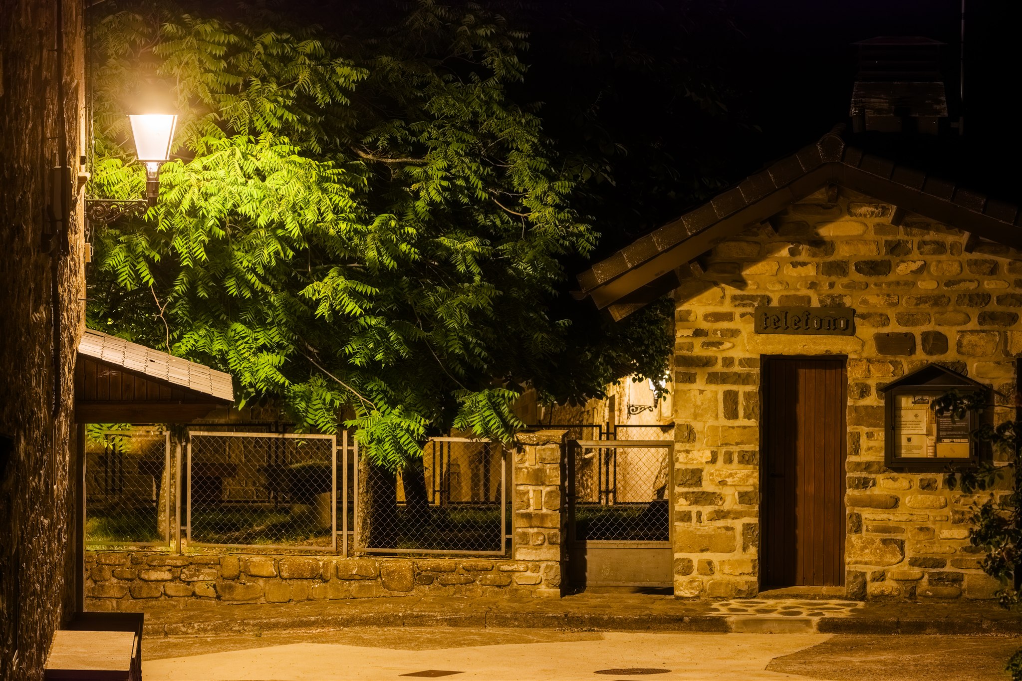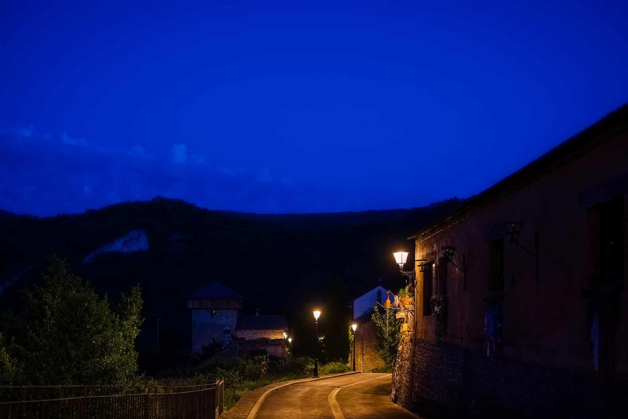 Alumbrado cálido y uniforme junto a las fachadas de piedra, reforzando la identidad rural del núcleo.