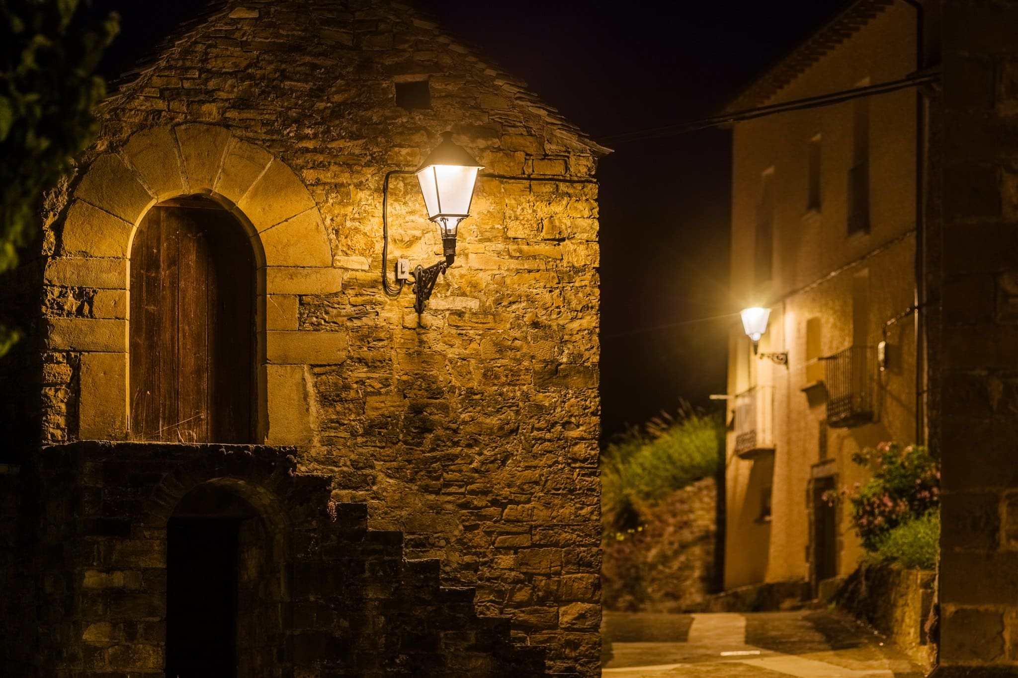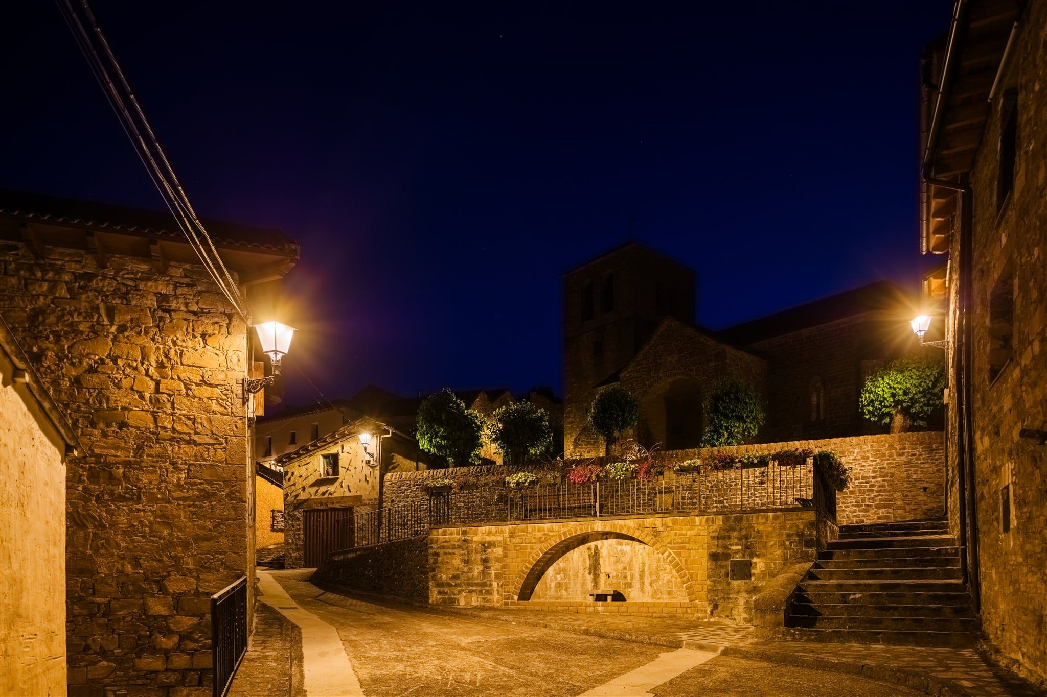 El casco histórico de Sinués, iluminado con luminarias Villa XLA LED 2200 K, integradas en su arquitectura tradicional.
