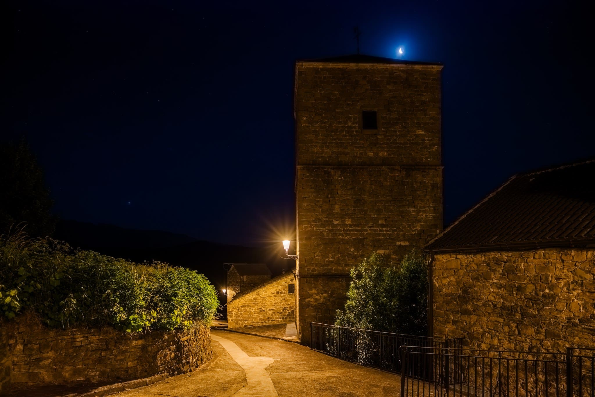 Torre de la iglesia parroquial de San Esteban iluminada con luz cálida, preservando la silueta histórica del conjunto.