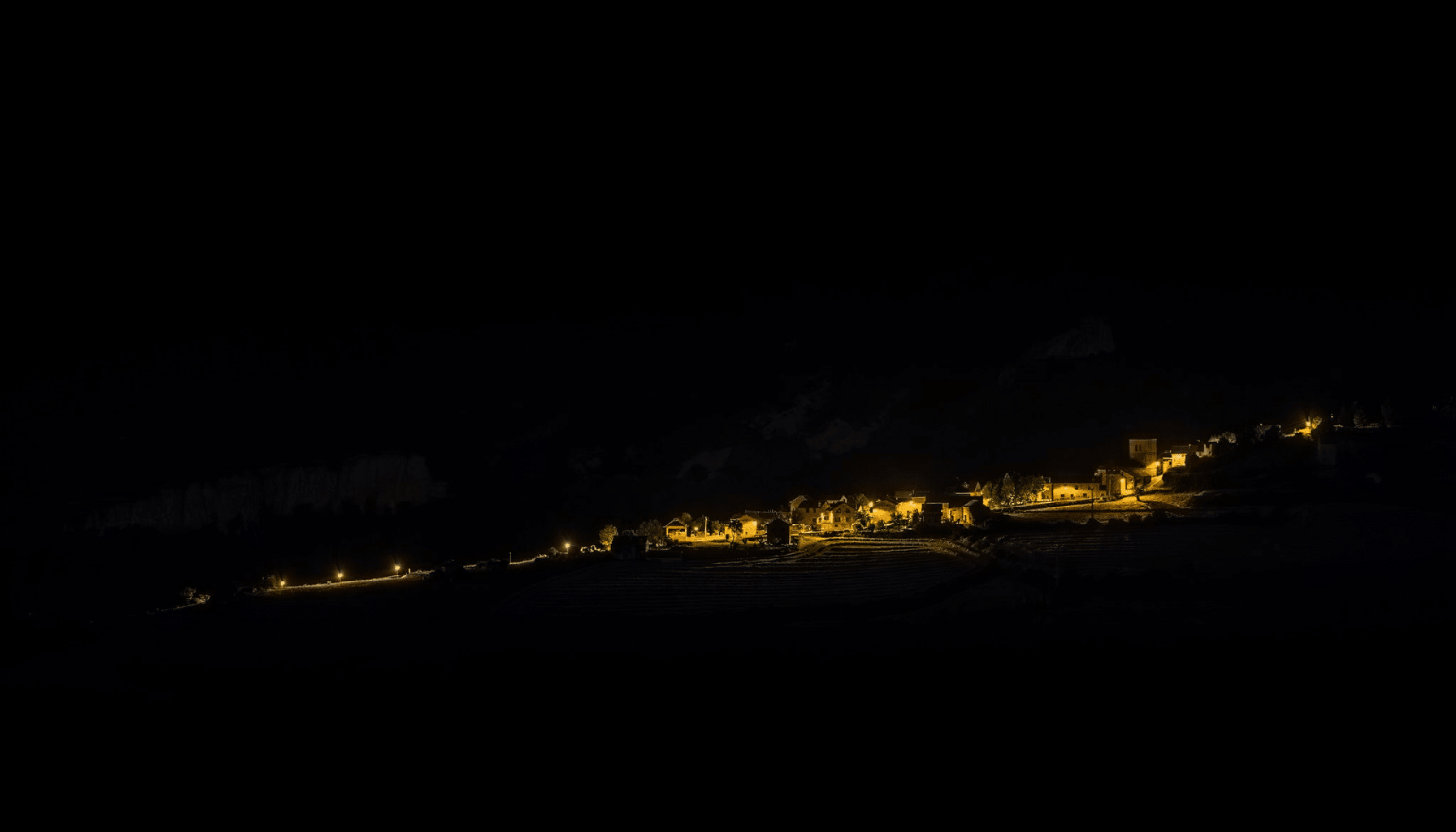 Vista nocturna general de Sinués, con un sistema lumínico que concentra la luz en el núcleo urbano y mantiene el resto del paisaje con su oscuridad natural.
