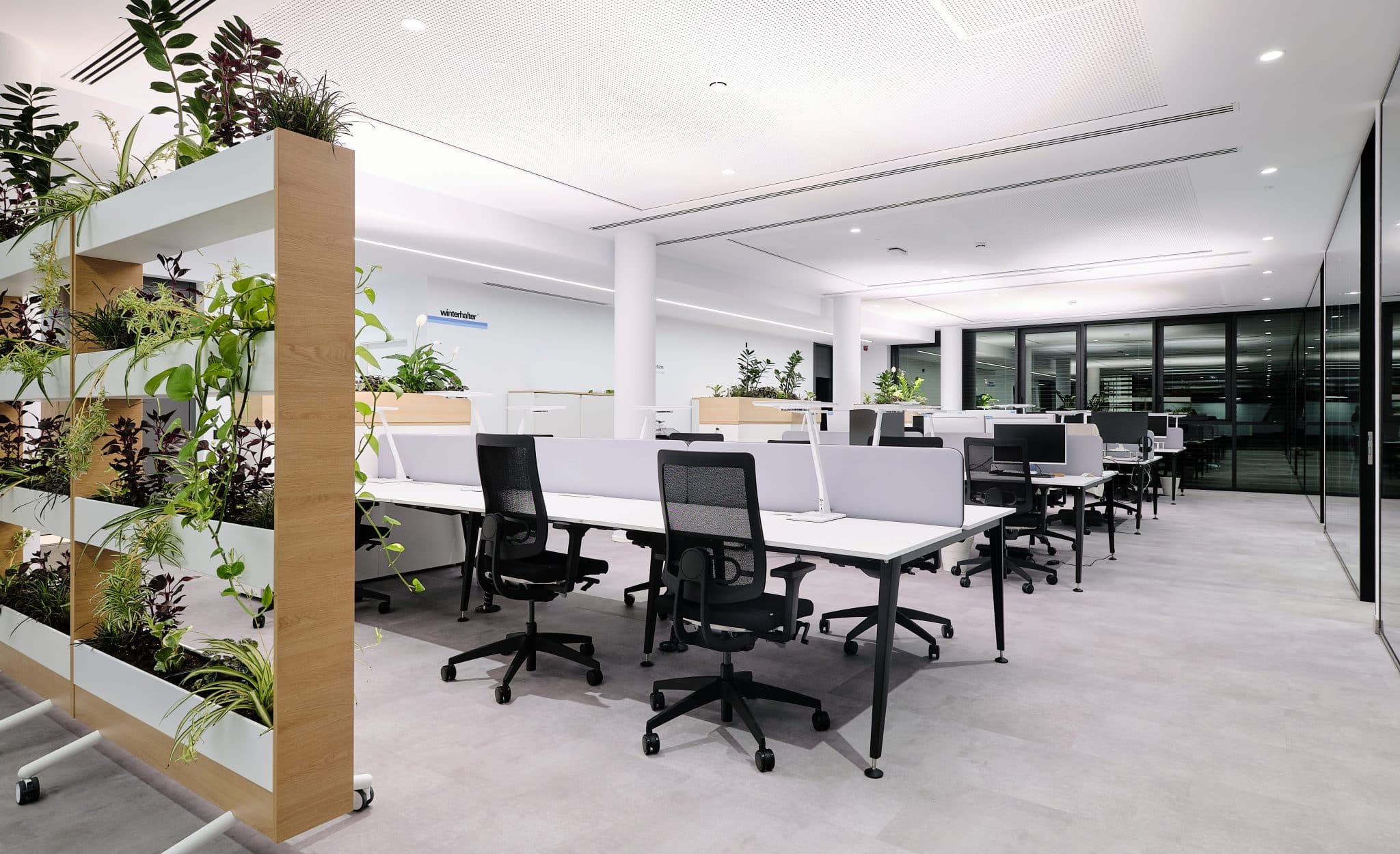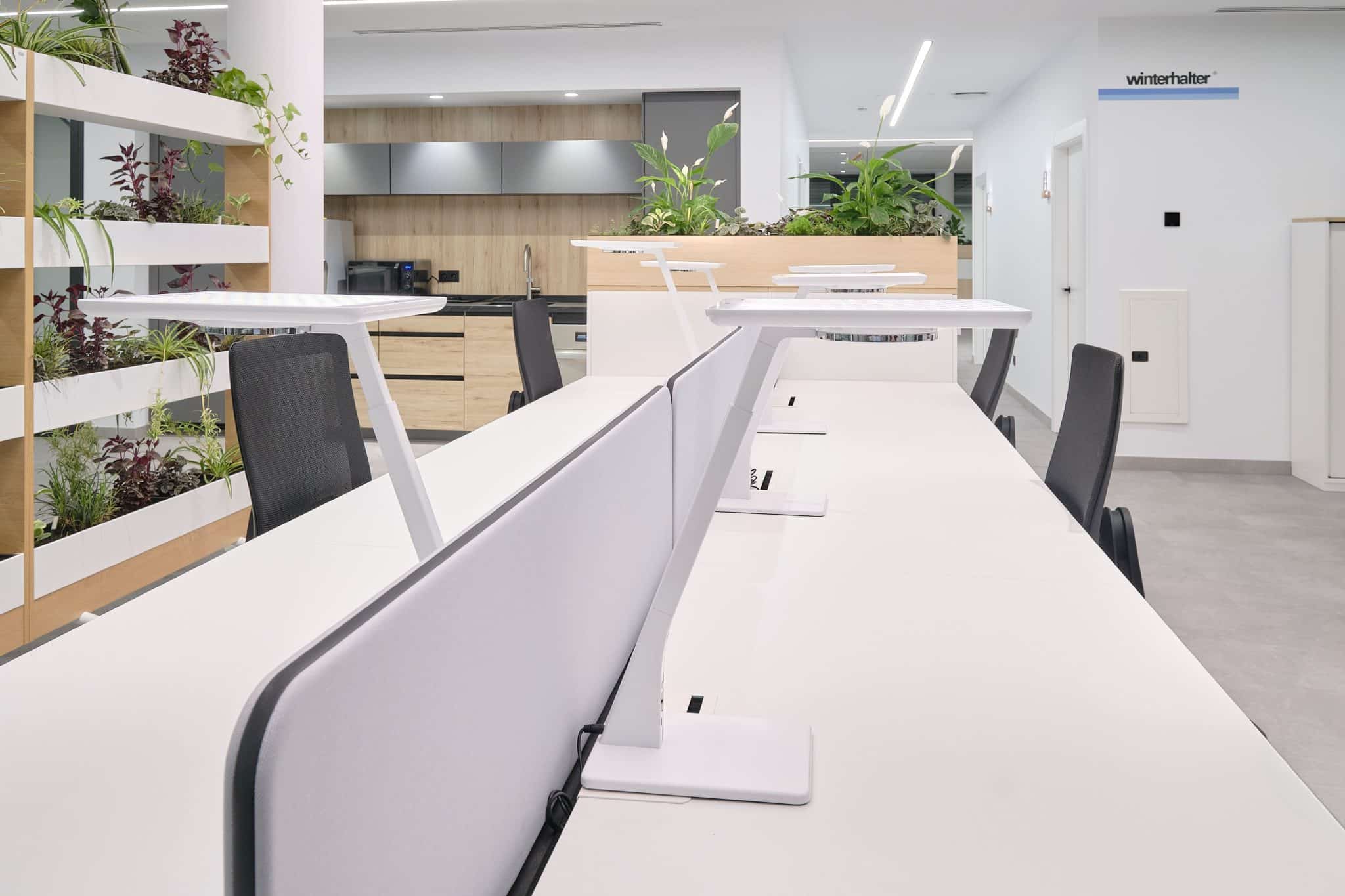 El nuevo edificio de Winterhalter se caracteriza por su arquitectura inteligente, su equipamiento de alta tecnología y su apuesta por el diseño centrado en las personas. Las instalaciones incorporan persianas automáticas reguladas por señal satelital, sensores de luz y sistemas de control energéticamente eficientes, que optimizan el consumo y mejoran el confort de los trabajadores.
