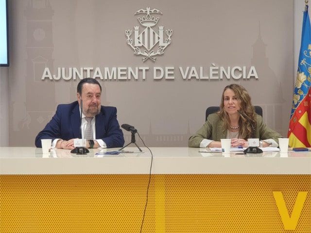 La concejala delegada del Área de Patrimonio, Recursos Humanos y Técnicos en el Ayuntamiento de Valencia, Julia Climent, y el presidente del Comité Español de Iluminación, Fernando Ibáñez, han presentado las novedades del congreso durante una rueda de prensa celebrada en el Ayuntamiento de Valencia.